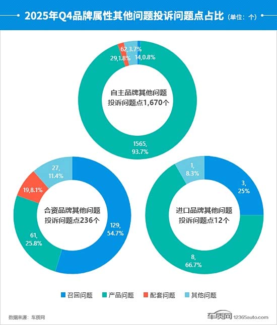 从其他问题投诉问题点占比可以看到,合资品牌的问题点数量增幅明显,与三季度相比上涨159.3%,召回问题和产品问题是增长主要来源。反观自主品牌,投诉问题点同样出现了环比增长,从占比情况来看,呈现出向产品问题高度集中的趋势。