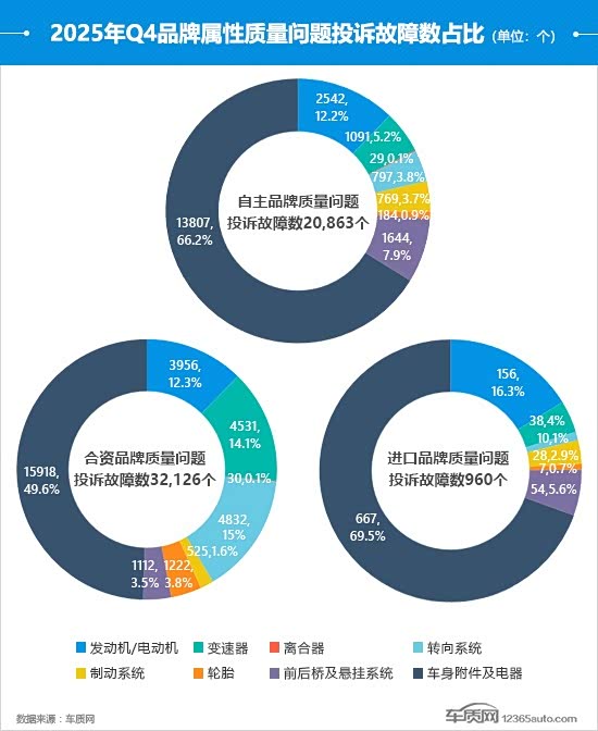 四季度,自主、合资和进口品牌的质量问题投诉故障数都出现了下滑,进口品牌的故障数已不足千个。从投诉故障数占比变化来看,自主品牌的主要增长点来自于车身附件及电器和发动机/电动机,两者占比分别较三季度提高了5.8个和1.2个百分点。而合资品牌中,轮胎的投诉故障数出现翻倍增长,占比提高了2个百分点,成为其新的投诉增长点。相比之下,进口品牌车身附件及电器的投诉故障数虽然环比下降,但占比反而提高了3.6个百分点。