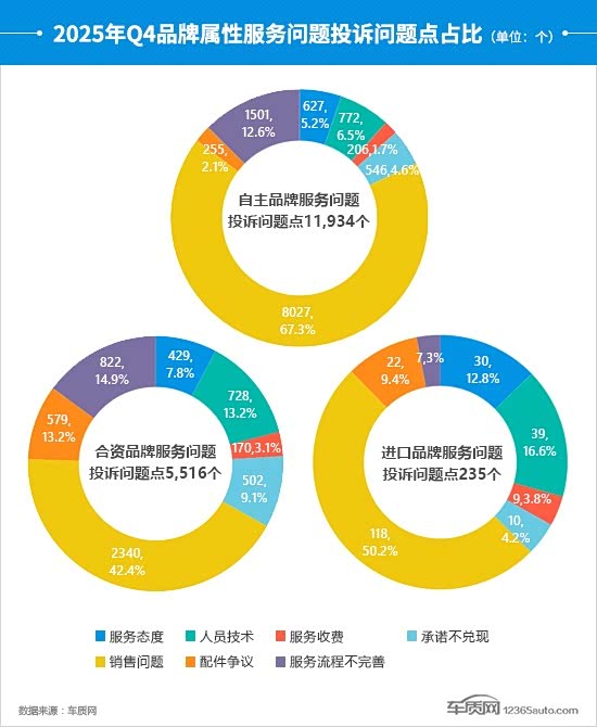 四季度,合资品牌和进口品牌的投诉问题点数量环比均呈增长态势,后者涨幅领先,较三季度上涨38.2%,销售问题是拉动其增长的核心因素。同期,自主品牌不仅投诉问题点数量环比出现下降,占比情况也发生变化。销售问题进一步扩大份额,已超过总量的2/3,环比提高18.3个百分点。