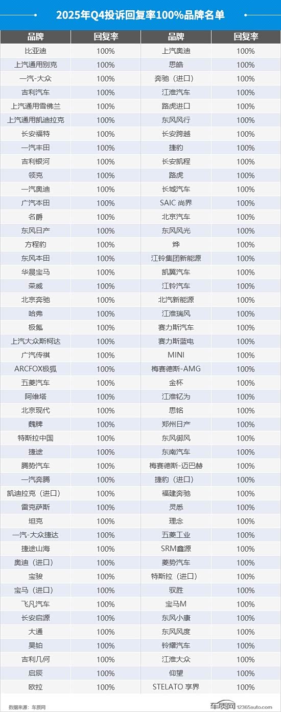 四季度投诉回复率达到100%的品牌共有94家,较上季度增加8家,这些品牌对待消费者诉求的积极态度以及重视程度值得肯定。当然,还有一些品牌表现不佳,如理想汽车、一汽红旗和iCAR等,投诉回复率依然不足50%,对于车主合理诉求的重视程度亟须加强。