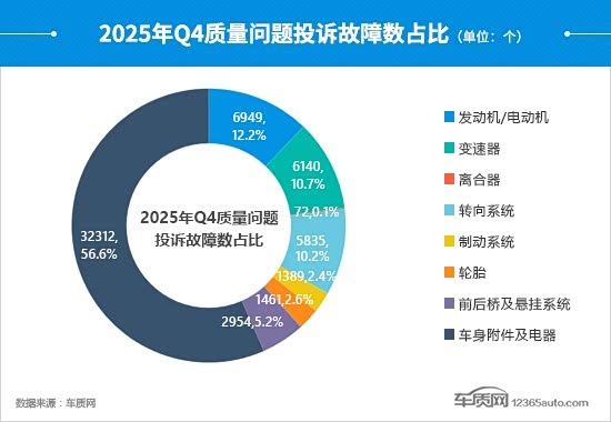 从质量问题投诉故障数占比情况来看,四季度车身附件及电器占比较上季度提高5.1个百分点,达到年内最高点;对应投诉故障数环比上涨6.3%,其中,“影音系统故障”依然是投诉焦点。此外,发动机/电动机的占比较三季度提升1.7个百分点,投诉故障数环比涨幅达12.1%,“发动机/电动机故障灯亮”是其投诉主要增量来源。