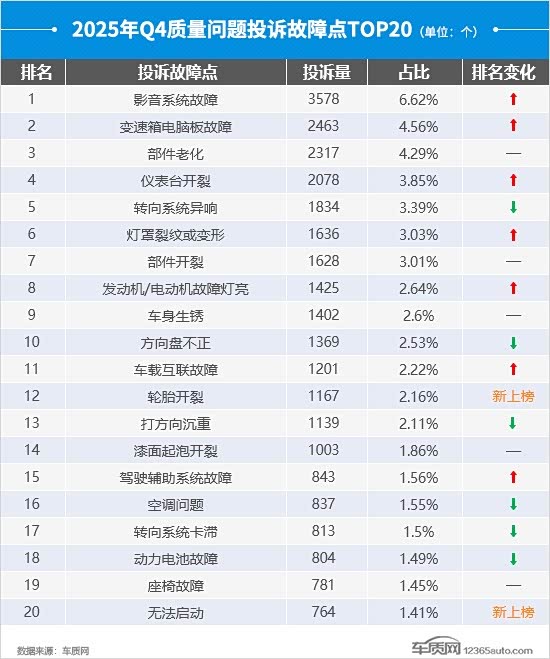 四季度TOP20投诉故障点中,“影音系统故障”排名重返首位,投诉故障数环比上涨10.9%。“灯罩裂纹或变形”本季度投诉故障数涨幅较大,排名升至第6位。“车载互联故障”排名同步提升,从三季度的第15位升至第11位,投诉故障数上涨33.4%。值得注意的是,本季度新上榜故障点共有2个,与三季度保持一致,其中“轮胎开裂”排名榜单中游,投诉故障数超千个。