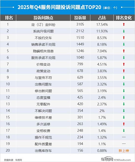 从TOP20投诉问题点榜单来看,“定(订)金纠纷”排名升至首位,投诉问题数环比上涨54.5%。伴随着车企促销力度加大,四季度“不按约交车”问题卷土重来,排名飙升至第3位,投诉问题数暴涨逾4.1倍。