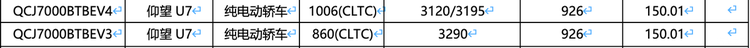 新款仰望U7提供插混版和纯电版,此前插混版已经完成申报工作,将增加全新灰色配色,提供更多的选装配置,比如电子外后视镜、碳纤维侧裙板、20英寸轮圈以及彩色喷涂的刹车卡钳等。插混版搭载2.0T+四电机组成的插混系统,电机总功率达到1000kW,匹配52.3987kWh电池组,纯电续航200km和220km。纯电版电机预计总功率达到1000kW,匹配150.01kWh,纯电续航分别为860km和1006km。