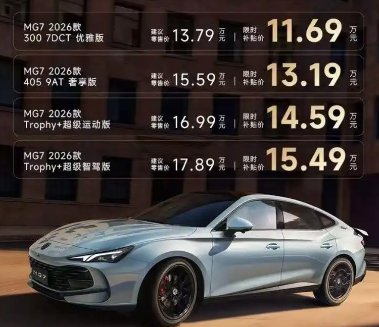 1月6日,上2026款 MG7(参数|询价)正式上市。新车共推出4款配置车型,官方指导价区间为13.79-17.89万元,品牌同步推出限时补贴政策,补贴后入门车型价格可低至11.69万元,同时涵盖限量装备升级、至高8000元置换补贴等购车权益。作为名爵品牌运动中型车系列的升级款产品,新车在家族运动设计基因基础上,针对智能配置与动力调校进行优化,面向追求个性与实用兼顾的消费群体。