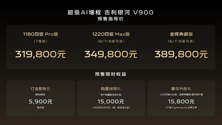 今天吉利银河品牌旗下中大型MPV车型V900正式启动预售,这台车相当于是翼真L380的增程版本!继小鹏X9之后又一中大型增程MPV要来了,看来全家长途出行的需求将有更多选择了。V900共推出3款配置车型,预售价区间定格在31.98-38.98万元。作为定位家用与商务双重场景的新能源MPV,预售发布会上官方那个披露了动力总成、空间利用、智能配置及智驾安全等核心信息,我们就来给大家分析分析。