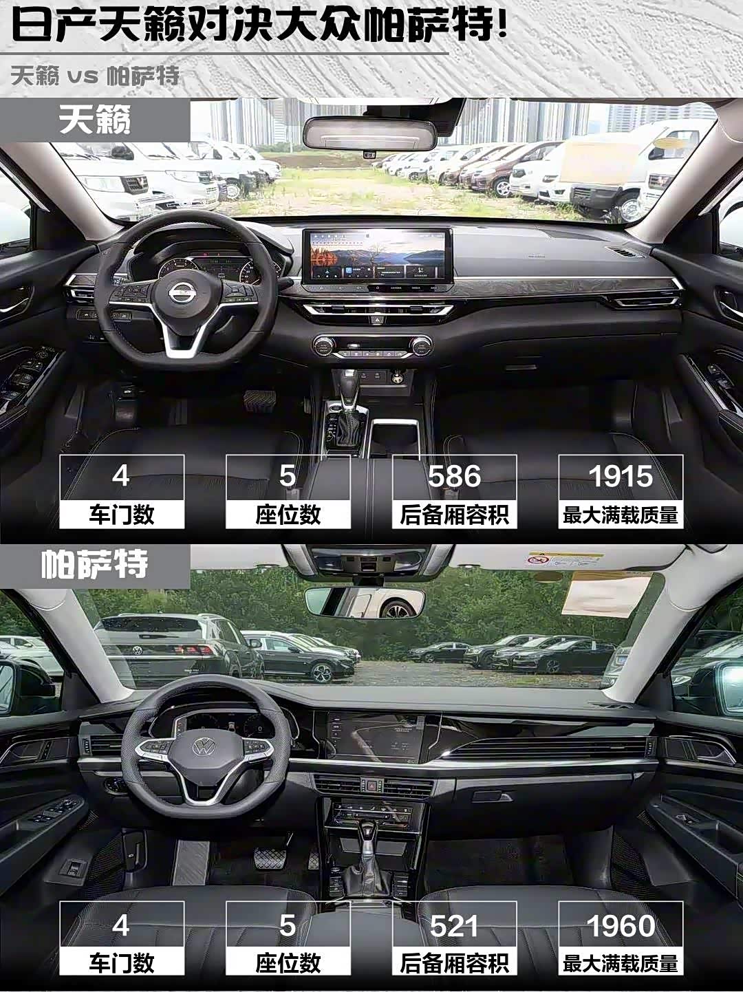 帕萨特4948mm车长确实能打,后排轻松二郎腿,521L后备箱比天籁小但更规整。不过!天籁的零重力座椅YYDS💺 12向电动调节+气动腿托,开长途腰不酸,日产大沙发绝非浪得虚名~ 但溜背造型让1米8以上乘客后排顶头,这点帕萨特1469mm车高反而占优。