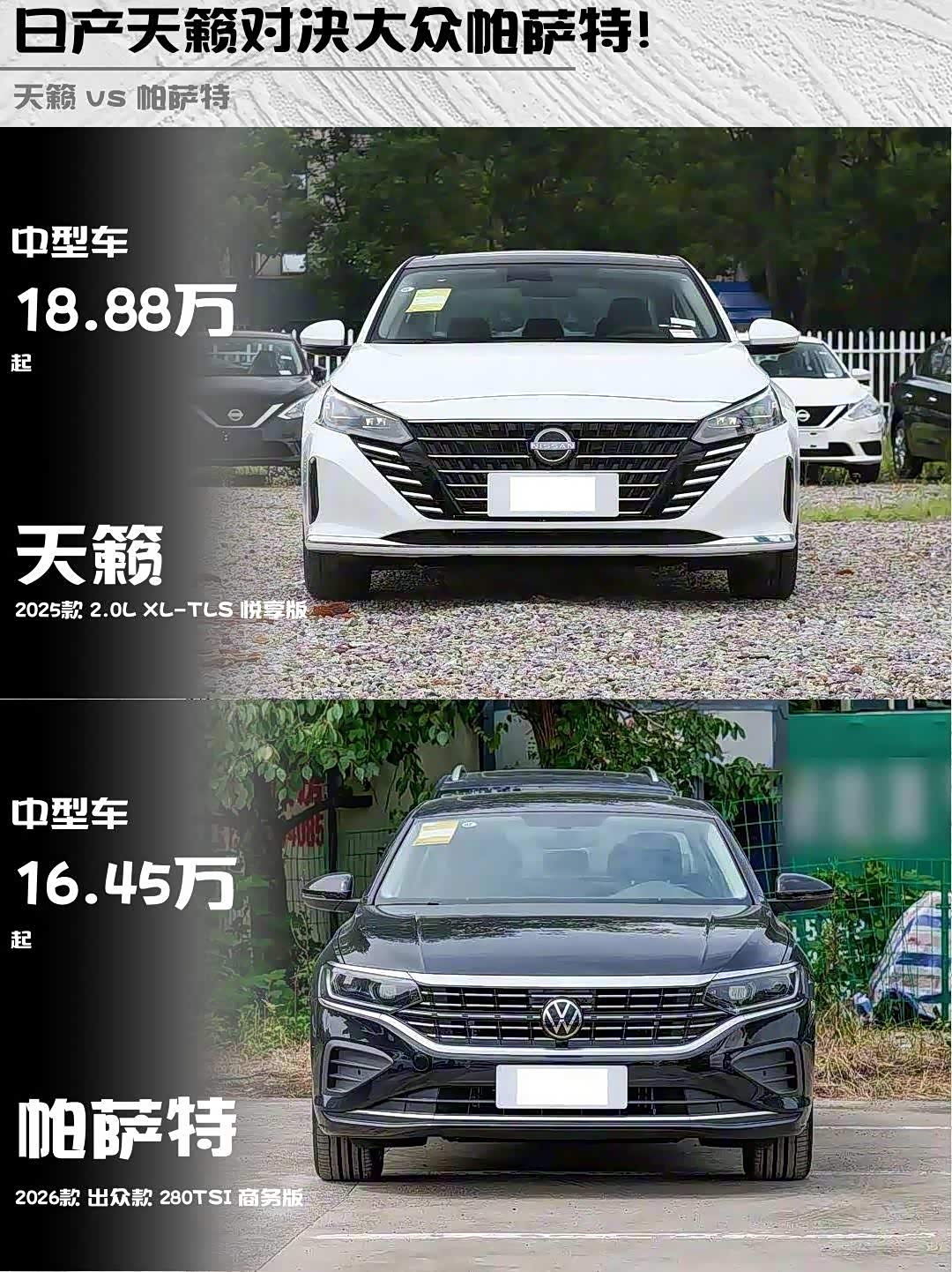 最近在选B级车的小伙伴看过来!今天深度对比两款热门选手——日产天籁2025款2.0L XL-TLS悦享版和 大众帕萨特(参数|询价)2026款出众款280TSI商务版,实测干货直接上硬菜🔥