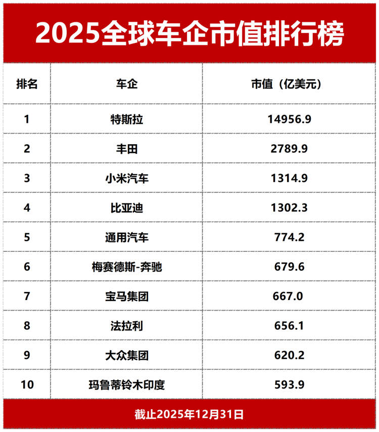 随着全球汽车产业变革持续深化,电动化与智能化浪潮推动车企市值格局再度洗牌。从2025年全球十大车企市值排行榜来看,特斯拉依旧稳坐全球上市车企市值榜首,以近1.5万亿美元的规模成为全球汽车行业唯一市值突破万亿美元的企业;市值排名第二的丰田汽车,市值突破2,789亿美元;2021年才正式进军汽车领域的小米汽车,以1,314.9亿美元排在第三;蝉联全球新能源汽车销冠的比亚迪,以1,302.3亿美元市值位居榜单第四。