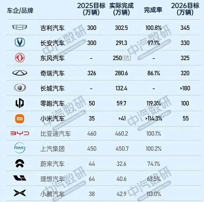 从2025年销量完成情况来看,头部车企表现各异。比亚迪、上汽、吉利等凭借成熟体系精准达成目标,零跑、小鹏、小米等新势力依托爆款产品超额完成任务,而蔚来、理想、奇瑞等则受多重因素制约,完成率相对偏低。在此背景下,在2026年目标设定上,传统车企稳健、新势力激进,行业“抢蛋糕”式竞争愈发激烈。