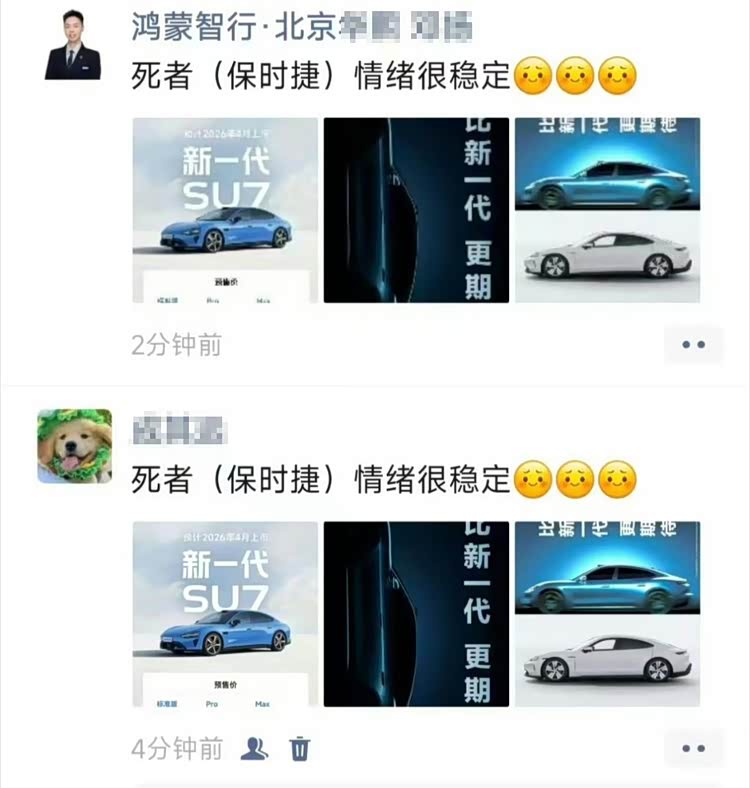 不过,在尚界汽车发布了尚界Z7的相关图片之后,我们也看到了鸿蒙智行的销售将小米SU7、尚界Z7的图片同时放在了自己的社交朋友圈,并且配文也说得很直白,那就是保时捷“走”时情绪稳定。我们不太确定这位销售表达的意思是什么,到底是小米SU7和尚界Z7的外形过于出挑,所以保时捷是被活活“气走”的,还是说小米SU7和尚界Z7形成的中大型轿车“双7”阵容,直接就把保时捷Taycan的市场份额完全就挤没了。我们更加倾向于前者,因为尚界Z7没出现的时候,保时捷这款纯电的销量就相当一般了……
