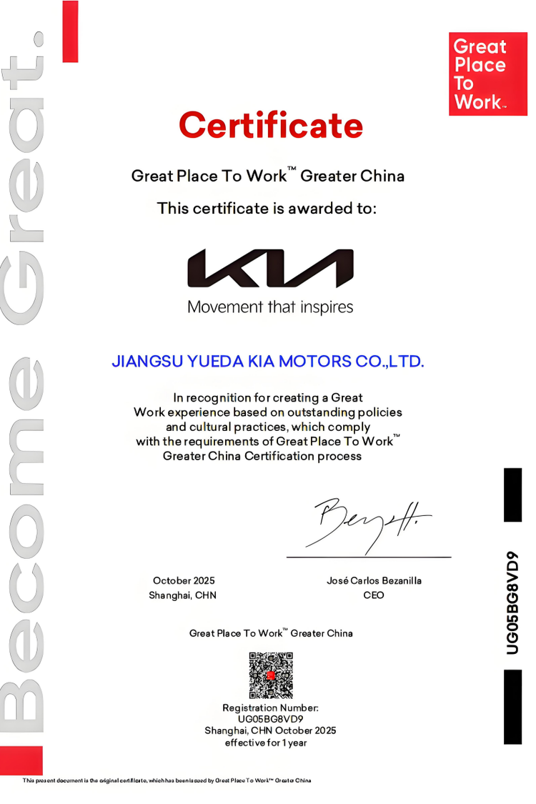 值得关注的是,在行业极度内卷的背景下,悦达起亚积极推进组织文化变革,构建了企业与员工和谐共生、双向赋能的职场生态,深入践行“以人为本”的长期主义发展理念。凭借在职场文化、人才梯队、员工关怀等领域的卓越实践,悦达起亚以93%的员工信任指数,高分荣获全球权威职场文化评估机构——Great Place To Work® (卓越职场研究所)颁发的“卓越职场”认证,成为2025年中国汽车行业唯一获得此项殊荣的汽车企业。