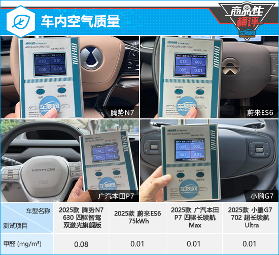 在车内空气质量测试对比环节,除腾势N7的测试数值略高外,其余三款车型的车内甲醛含量均为0.01mg/m3。四款车型都符合2012年3月1日起实施的,由原环保部和国家质量监督检验检疫总局联合发布的《乘用车内空气质量评价指南》(中华人民共和国国家标准GB/T 27630-2011)中的相关标准。
