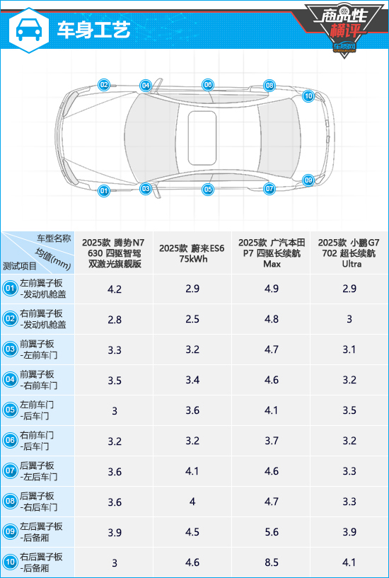 在车身工艺测试对比环节,从测试结果来看,小鹏G7表现相对更好,整车缝隙均匀度把控不错,仅两侧后翼子板与后备厢连接处缝隙均值稍高。腾势N7全车绝大多数部位的缝隙均值也控制在相对较低水平,不过前翼子板与发动机舱盖连接处存在两侧缝隙均值相差较大的情况,影响了最终测试成绩。相比之下,广汽本田P7全车多个部位的缝隙均值高于其余三款车型,并且右后翼子板与后备厢连接处的缝隙均值高达8.5mm,导致失分较多。