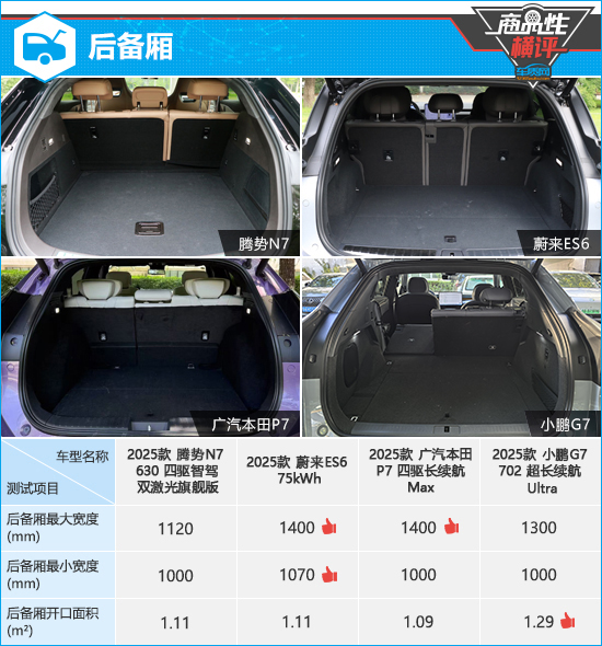 在后备厢测试对比环节,从实测数据来看,小鹏G7的后备厢开口面积相对较大。蔚来ES6和广汽本田P7的后备厢最大宽度数值处于领先地位,并且前者在后备厢最小宽度测试中也以微弱优势胜出。