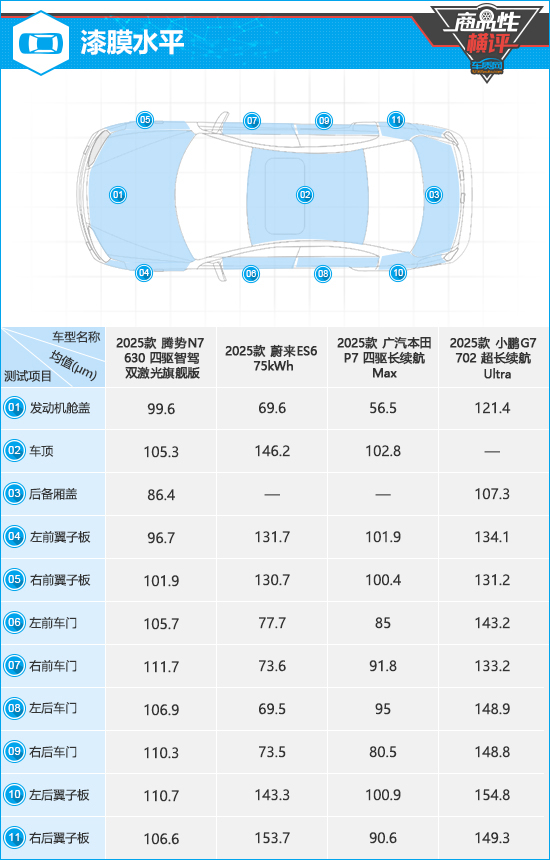 在漆膜水平测试对比环节,需要指出的是,蔚来ES6和广汽本田P7的后备厢盖,以及小鹏G7的车顶均采用非金属材质打造,因此未测得有效数据。从测试结果来看,小鹏G7虽然个别部位的漆膜喷涂均匀性表现一般,但仍以较大优势取胜,整车漆膜平均厚度达到同级别车型中游水平。相对而言,其余三款车型的整车漆膜平均厚度均处于同级别车型中下游水平,并且由于各测试点之间数值浮动较大,反映出漆膜喷涂均匀性也存在提升空间。