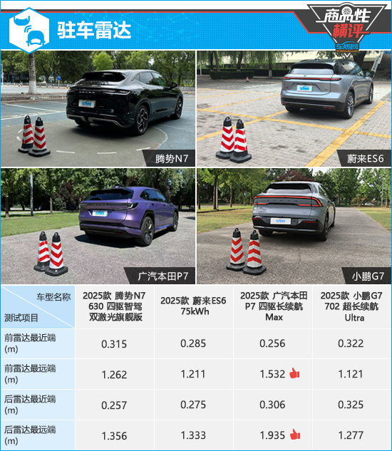 在驻车雷达测试对比环节,根据已有测试数据来看,广汽本田P7前后雷达探测能力相对较强,最远端数值均超过1.5m。最近提示距离方面,蔚来ES6表现相对较好,前后雷达最近端数值与同级别车型测试均值更加接近。
