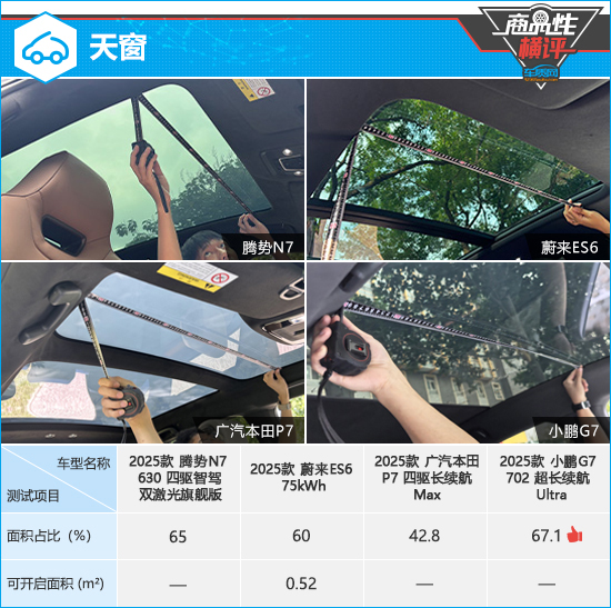 在天窗测试对比环节,蔚来ES6配备可开启全景天窗,广汽本田P7配备分段式不可开启天窗,腾势N7和小鹏G7则配备不可开启全景天窗。具体尺寸来看,根据已有测试数据,小鹏G7的天窗面积占比相对较大,采光效果出色。蔚来ES6的天窗由于采用可开启设计,实用性表现同样令人满意。