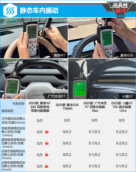 在静态车内振动测试对比环节,腾势N7以明显优势取胜,方向盘和全车座椅在两种状态下的振动数值均为0。相比之下,小鹏G7前排座椅在启动后静止状态下的振动数值略高于其余三款车型,对测试结果造成一定影响。
