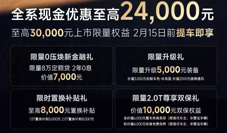目前购车除了限时价格优惠价外,在2026年1月6日至2月15日期间,还可享受诸多购车权益,包括:2年0息贷款(可节省利息7000元)、限量升级礼(含价值3000元定制车色+价值2000元座椅通风)、至高8000元置换补贴(1.5T车型置换补贴5000元,2.0T车型置换补贴8000元),以及限量2.0T专属权益(价值10000元双保权益,含整车终身质保+终身免费保养)。