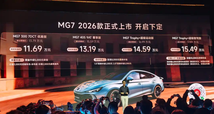1月6日,上汽名爵旗下的2026款 MG7(参数|询价)正式上市,新车共推出4款车型,官方指导价区间为13.79万-17.89万元,限时补贴价仅需11.69万-15.49万元。26款车型将升级重点放在了智能化领域,配备NGP高阶辅助驾驶系统(可实现高速辅助驾驶)、AI语音大模型等多项同级领先配置。在其他外观、内饰设计和动力底盘等方面则维持原状。