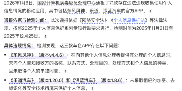 与此同时,根据最新消息:1月6日,有71款APP被通报存在违法违规收集使用个人信息情况,其中包括东风风神、乐道、深蓝3家汽车企业APP。