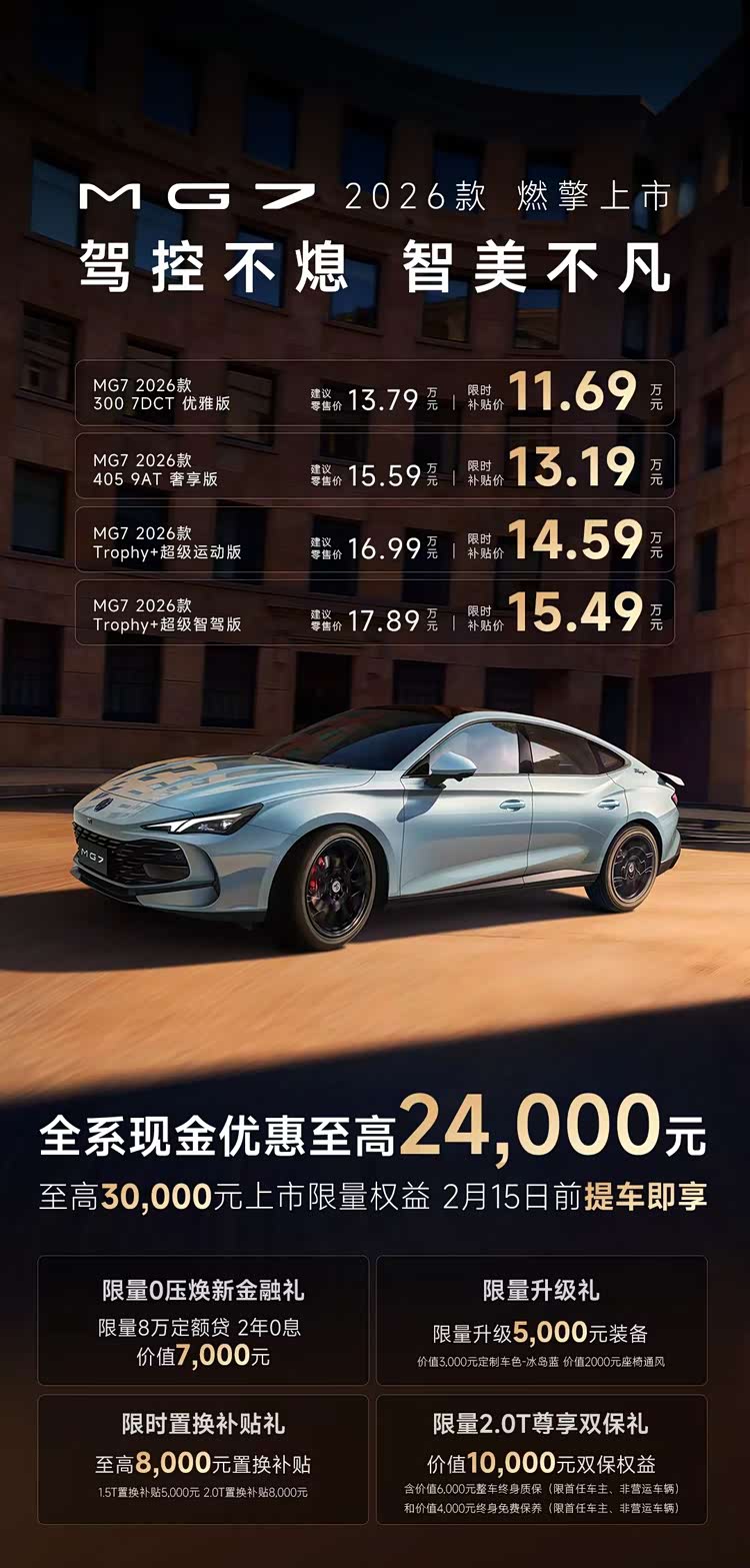 2026款 MG7(参数|询价)刚完成上市。这台中型轿车没有MG4销量、口碑两翼齐飞,也没蹭到新能源热度,根据乘联会数据,MG7去年销量仅1.4万出头,市场表现谈不上主流。对于品牌而言,想要挽救MG7需要一剂猛药。