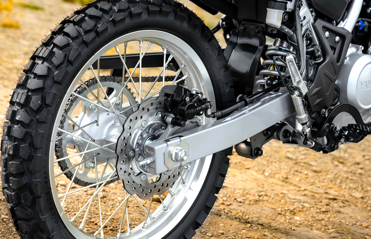 在车体方面,新旧版本无明显变化,该车所采用的是钢管材质的半摇篮式车架,并配套有正立式前叉、后中置减震器,以及前21后18寸的辐条轮毂,这种组合使其具备了138kg的整备质量和265mm的离地间隙,因而会有较强的越野属性。