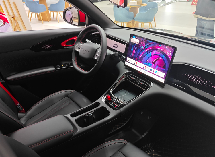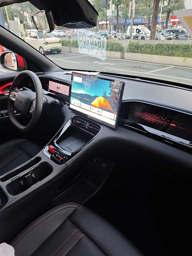 内饰也有专属的“曜石黑”风格,并在细节处加入红色缝线/红色饰件点缀,并采用运动多功能方向盘、专属刺绣头枕、红色运动安全带、红色内门把手、红色能量拨挡、256色星动氛围灯以及律动能量音响装饰罩等,继续烘托驾驶氛围。而14.6英寸悬浮大屏和内嵌式液晶仪表也没有缺席,并搭载银河Flyme Auto智能座舱系统,支持双区语音交互、手车互联、高德导航、远程控制等。