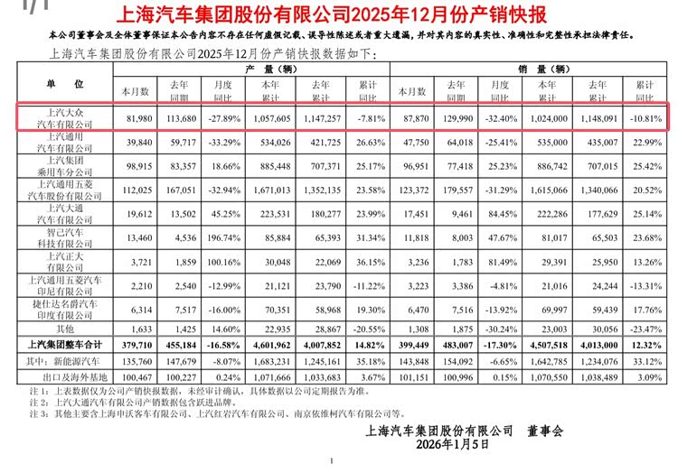 来自上汽集团的12月销量快报显示,2025年12月上汽大众销量仅有8.78万辆,同比跌幅达32.4%,而今年1-12月累计销量虽然再破百万,达到了102.4万辆,但是却同比下滑了10.81%。而且更令人咋舌的是,这也是上汽大众连续三年销量年度下滑。