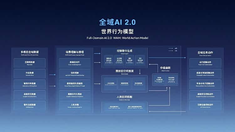 即WAM 世界行为模型(整车大脑)+ 全域AI 2.0(跨域融合)+ Eva 超拟人情感智能体(整车中枢)+ 千里浩瀚 G-ASD(高含模量智驾)。