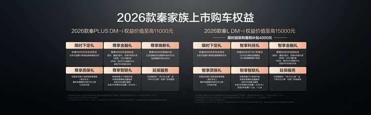 日前,2026款秦L DM-i/ 秦PLUS(参数|询价) DM-i长续航版宣布上市,其中,2026款秦L DM-i 210KM长续航版限时超级优享价11.28-12.28万元;2026款秦PLUS DM-i 210KM长续航版售价区间为8.98-9.98万元。同时,官方还推出了多重上市权益礼。