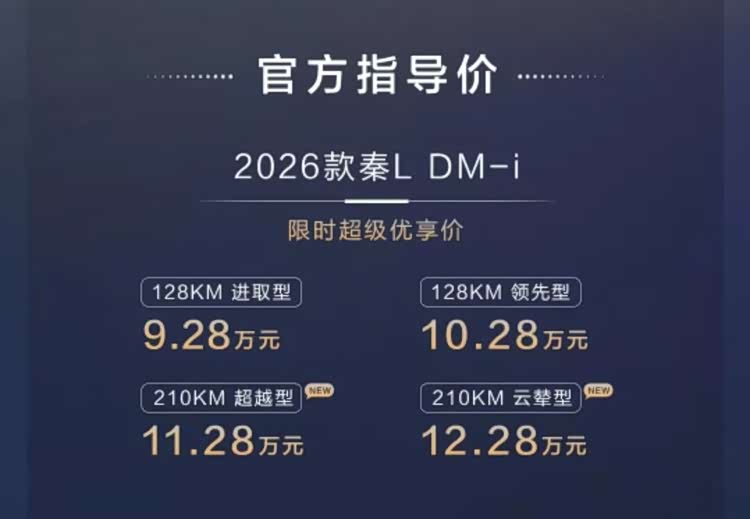 【新车上市】近日,2026款比亚迪秦L DM-i 正式上市,新车售价9.68-12.68万,限时超级优享价9.28-12.28万。此次新车最主要的变化是推出2款210km长续航版本,另外配置也有所升级,配备了冷暖冰箱、云辇-C智能阻尼车身控制系统、TBC高速爆胎稳行系统。