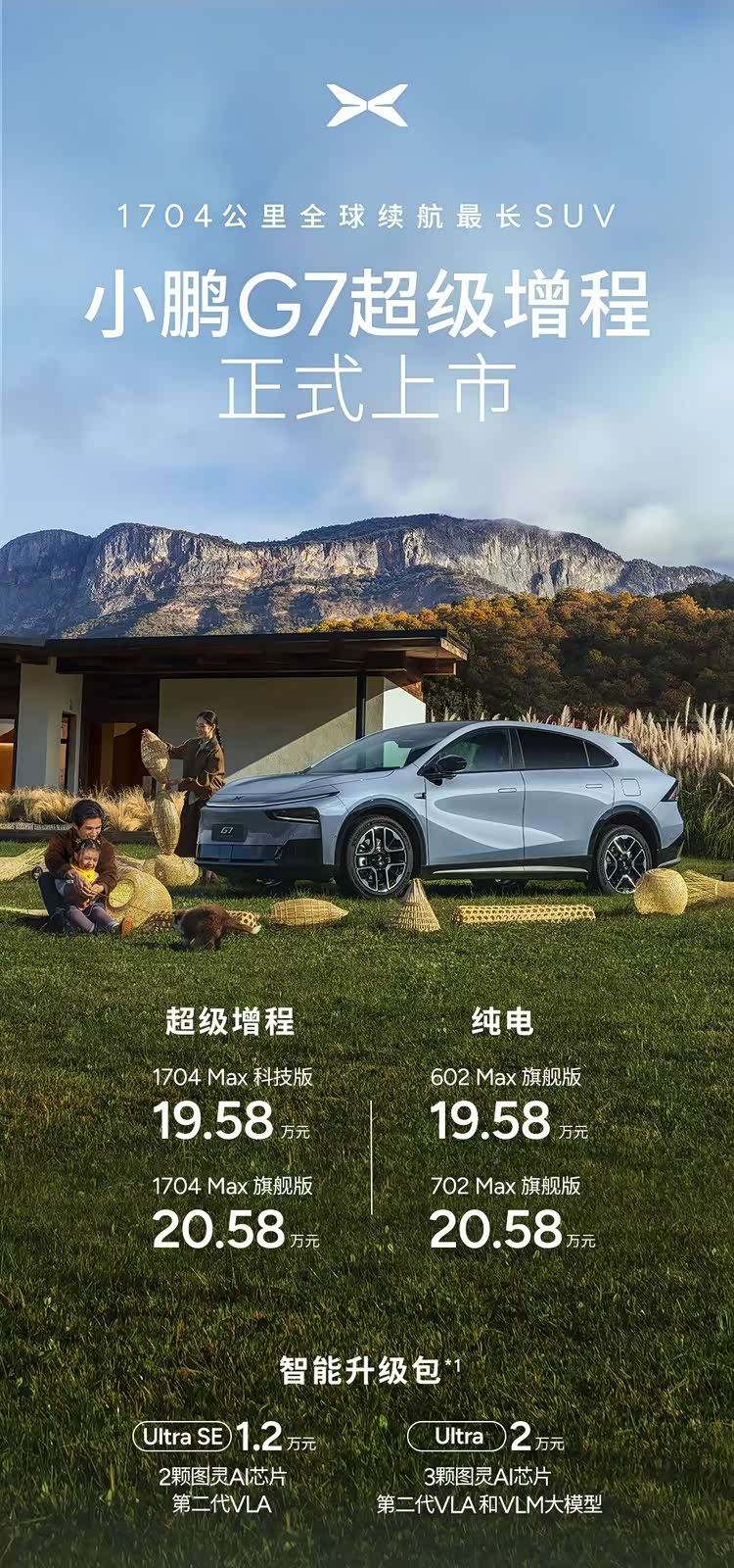 这次的另一大重头戏是全新G7超级增程版,它的纯电模式可以做出430km的续航表现,综合续航超过1700km。在价格策略上,正如开头所提到的,其基础版本与旗舰版本也和纯电选项看齐,分别定价19.58万和20.58万元。另外,全新G7超级增程版的智能升级包在硬件配置和定价上也跟P7+一致。