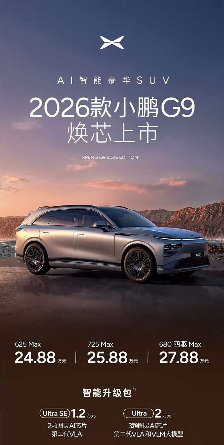小鹏开启了今年新年以来的首场发布会,2026款P7+、G7超级增程、G6以及G9一起上市。就像去年小鹏曾经许诺过的那样,这四款新车的Ultra版本都可以搭载小鹏的第二代VLA系统,理论上将会具备一部分L4初阶能力。
