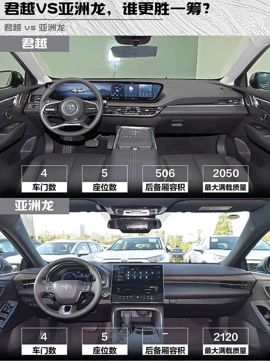 两车都接近5米车长,但君越后排腿部空间更奢侈,我183cm身高能轻松跷二郎腿。亚洲龙后排头部有点压抑,溜背造型牺牲了空间。不过亚洲龙座椅更符合人体工学,长途不腰酸;君越的大沙发虽然软,但支撑性稍弱。
