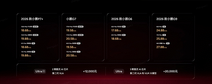 【2026年1月8日,广州】 今日,在2026小鹏全球新品发布会上,小鹏汽车正式发布2026 款小鹏 P7+、小鹏 G7 超级增程、2026 款小鹏 G6、2026 款小鹏 G9。其中2026款小鹏P7+ 全球36国同步发布,新车有超级增程和纯电两种能源形式,超级增程有1550 Max 科技版和1550 Max 旗舰版,官方指导售价为18.68万元和19.88万元;纯电有615 Max旗舰版和725 Max 旗舰版,官方指导售价为18.68万元和19.88万元。2026款小鹏G7推出四个版本,超级增程1704 Max 科技版和1704 Max 旗舰版,官方指导售价为19.58万元和20.58万元;纯电602 Max 旗舰版和702 Max 旗舰版,官方指导售价为19.58万元和20.58万元。2026 款小鹏 G6推出纯电625 Max 科技版和625 Max 旗舰版,官方指导售价为17.68万元和18.68万元。2026 款小鹏 G9推出纯电625Max、725 Max和680 四驱Max版,官方指导售价为24.88万元、25.88万元和27.88万元。