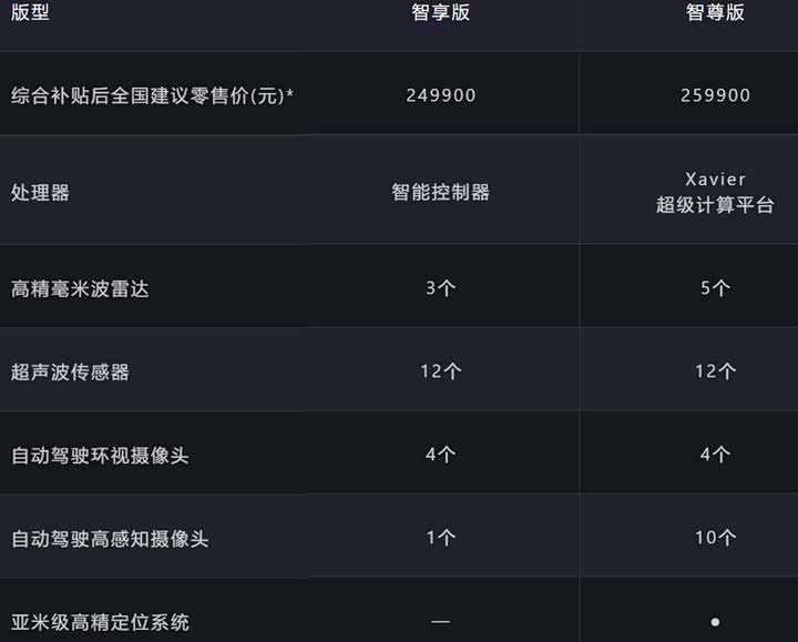 对于这多出的一万元硬件费用,智尊版在硬件上有所增加,如Xavier超级计算平台、毫米波雷达、高感知摄像头以及高精度定位系统等。