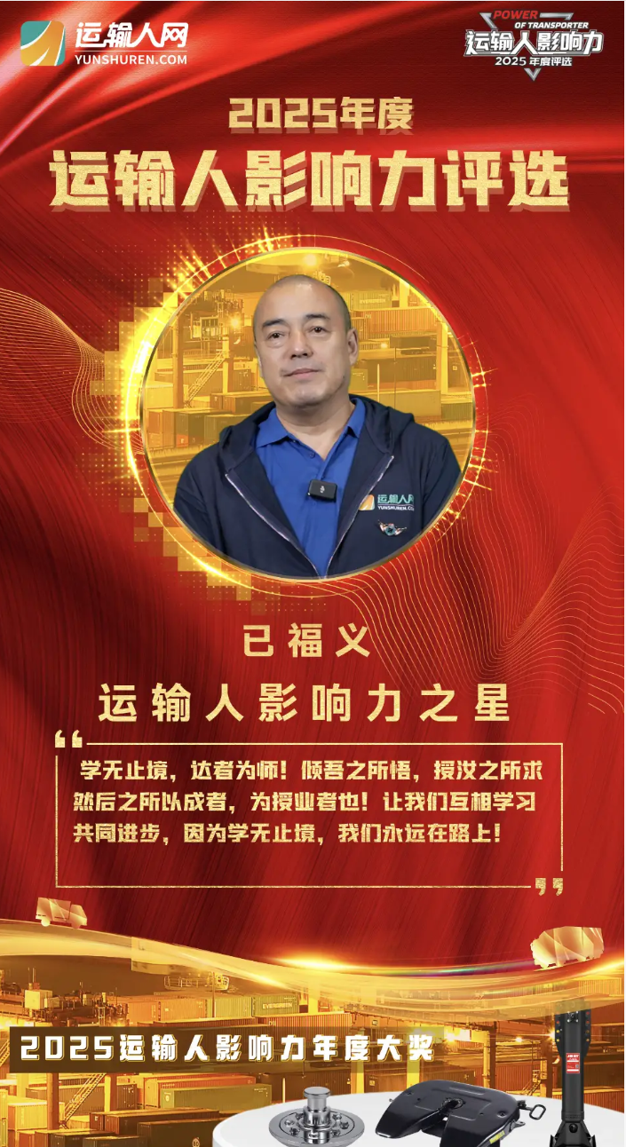 第九届运输人影响力年度评选中,来自黑龙江佳木斯的已福义荣获“2025运输人影响力年度之星”。他的职业宣言是:“学无止境,达者为师!倾吾之所悟,授汝之所求!然后之所以成者,为授业者也!”