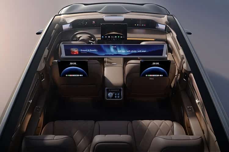 进入车内,车内副驾和二排座椅都是零重力左右,并且具备10点按摩功能。后排不仅有投影荧幕,还有一块可以拿起来的控制屏,放过去百万级也没有这样的体验。