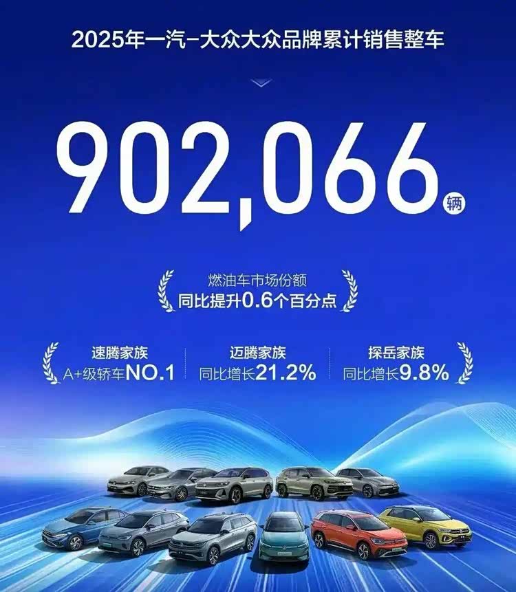 2026年1月1日,一汽-大众正式披露2025年度业绩报告,全年整车销量达1,587,065辆(含进口车),不仅再度蝉联合资车企销量第一、燃油车销量第一“双冠军”,更实现燃油车市场份额逆势同比增长0.9个百分点,创下历史新高。
