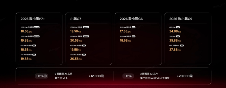 其中,2026款小鹏P7+纯电版与增程版同价,价格18.68-19.88万元;小鹏G7纯电版与增程版同价,价格19.58-20.58万元;同时2026款小鹏G9/G6迎来改款,整体价格17.68万元起。值得注意的是,据小鹏汽车CEO何小鹏透露:“今年小鹏还会推出4款全新的SUV,而且是面向全球的”。不难看出,2026年将是小鹏汽车的产品大年。