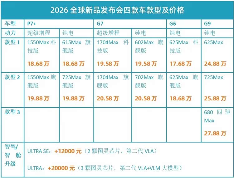 2026款 小鹏G6(参数|询价)与2026款小鹏G9主要变化是换芯。