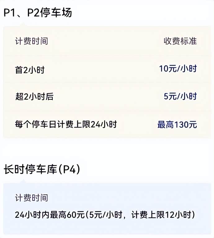 P1、P2 停车场免费停放时长 20 分钟;超过 20 分钟且累计停放≤2 小时,收费 10 元;超过 2 小时的部分,按 5 元 / 小时计费(不足 1 小时按 1 小时计算);单日最高收费 130 元。
