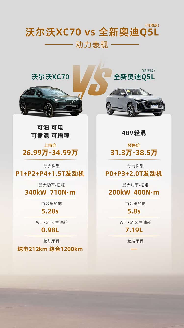 在豪华中型SUV市场,全新一代 奥迪Q5L(参数|询价)即将正式上市,新车通过全新电气架构和智能化的升级,实现了产品力的全面提升,而沃尔沃全新XC70同样作为这一领域的代表车型,整车始终以健康安全为核心竞争力。那如果手握30万预算,这两款车型该如何选择呢?接下来我们就通过多维度的体验和测评,来看看两款车型的表现到底如何。