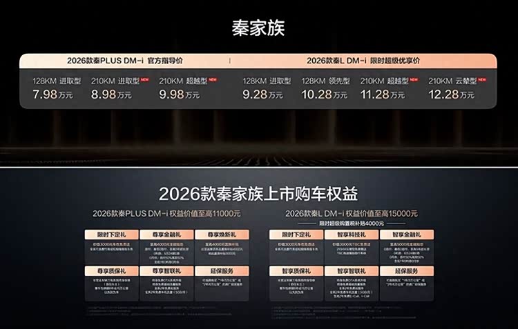 1月8日,比亚迪秦家族迎来重磅加推,2026款秦L DM-i /2026款秦PLUS DM-i 210KM长续航版双车同步上市,售价8.98-12.28万元。其中,2026款秦L DM-i 210KM长续航版限时超级优享价11.28-12.28万元,2026款秦PLUS DM-i 210KM长续航版售价8.98-9.98万元。同时,两款车型均带来了丰厚的上市权益礼。