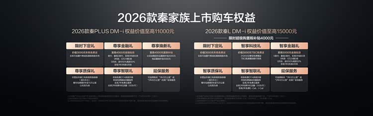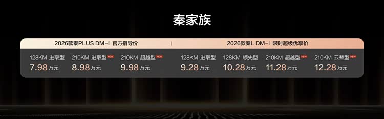 1月8日,比亚迪秦家族迎来重磅加推,2026款秦L DM-i /2026款秦PLUS DM-i 210KM长续航版双车同步上市,售价8.98万~12.28万元。其中,2026款秦L DM-i 210KM长续航版限时超级优享价11.28万~12.28万元,2026款秦PLUS DM-i 210KM长续航版售价8.98万~9.98万元。同时,两款车型均带来了丰厚的上市权益礼。