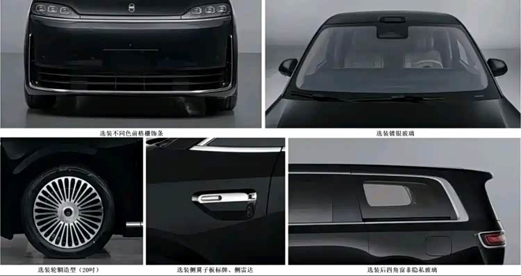 设计层面,智界V9延续鸿蒙智行“极致、简约、纯净”的家族设计语言。申报图显示,新车未采用主流的大嘴前脸设计,而是采用纯净光面造型,配备贯穿式灯带与两侧大灯组,疑似搭载尊界S800同款像素大灯,后续或首发全新一代DLP投影大灯和动态迎宾光毯组合。车身侧面线条舒展,长宽高分别为5359/2009/1879mm,轴距3250mm,搭配“大饼式”轮毂;车尾配备贯穿式尾灯,内嵌晶钻元素,同时带有智界英文字母标识。