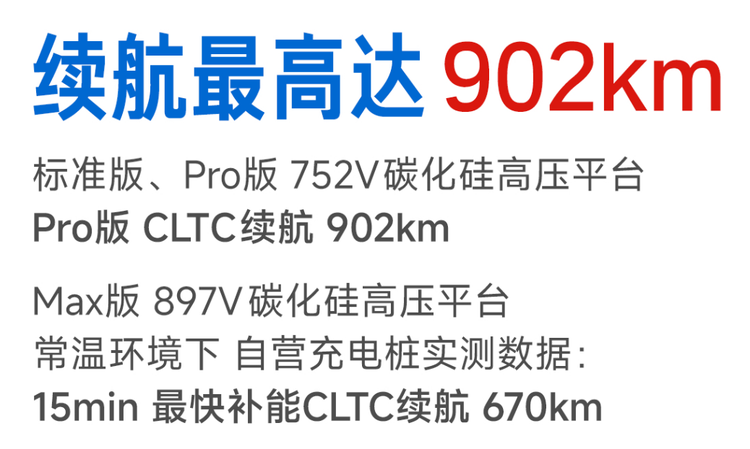 新车续航表现同样得到了提升,纯电续航分别是720km、835km、902km,其中高配的MAX版本充电15分钟可补能670km。