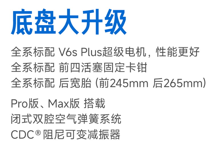 内饰新增“暗夜黑”配色,换上新样式多功能方向盘,车内增加更多软质材料包裹,细节设计与现款车型存在差异。新车重点针对配置作出升级,其中安全气囊从7个升级为9个,车身强度从2000MPa提升至2200Mpa,配备内嵌式防滚架,中高配车型升级搭载双腔空气悬架+CDC减震器。